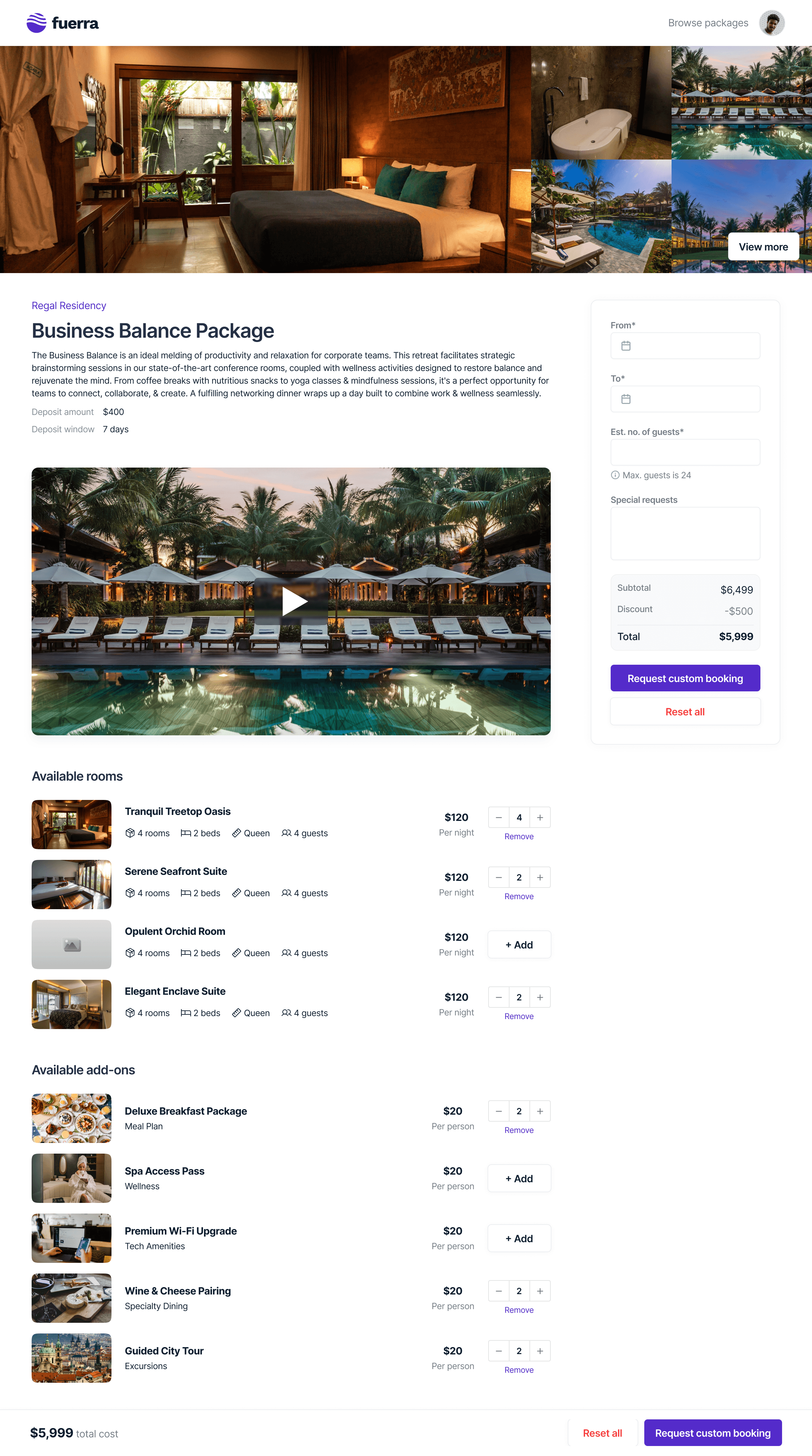 I introduced a multi-step flow (Rooms → Addons → Pricing) to guide users through complex inputs. Real-time calculations provide clarity on total cost and guest capacity, helping users make confident decisions without feeling overwhelmed.