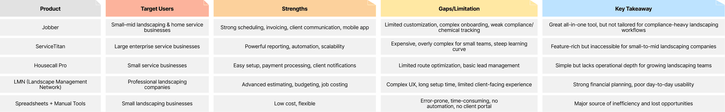 I evaluated existing field service and landscaping management tools to understand how current solutions support operational workflows, client communication, and scalability.